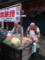一對淳樸又可愛的老夫妻一起彎著腰忙碌的包著料多好吃又實在的潤餅 就算再忙臉上也笑眯眯的 這就是幸福的台北吧