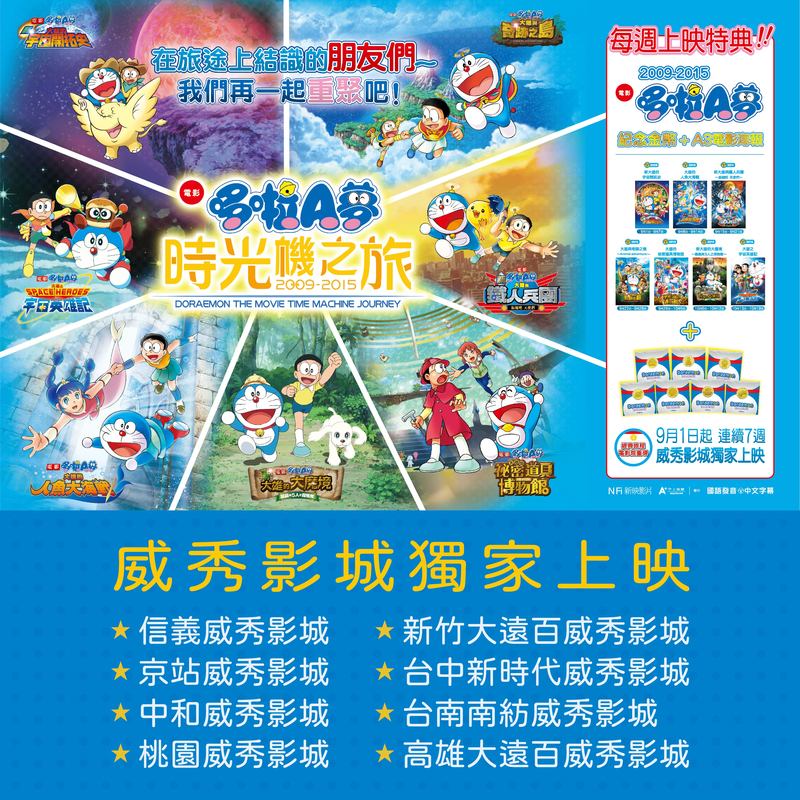 【哆啦A夢-時光機之旅】50周年經典影展片單 ●9/1-9/7《哆啦A夢:新大雄的宇宙開拓史》2009 ●9/8-9/14《哆啦A夢:大雄的人魚大海戰》2010 ●9/15-9/21《哆啦A夢:新‧大雄與鐵人兵團~振翅吧天使們》2011 ●9/22-9/28《哆啦A夢:大雄與奇跡之島》2012 ●9/29-10/5《哆啦A夢:大雄的祕密道具博物館》2013 ●10/6-10/12《哆啦A夢:新‧大雄的大魔境~扁扁與五人之探險隊》2014 ●10/13-10/19《哆啦A夢:大雄之宇宙英雄記》2015