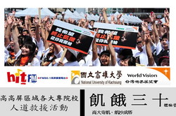 台灣世界展望會自2006年開始,於國內推動飢餓體驗DIY,邀請全台民眾參與體驗飢餓,獲得各界人士的熱烈響應。而今年高雄大學也即將在5月14、15日,於高雄大學活動中心,舉辦校際性的飢餓三十活動,藉由營隊的方式讓大家體驗飢餓、關懷弱勢,其中Hit Fm高屏電台的DJ也會參與這次的活動,包含了DJ講座,以及藝人私藏物品的公益拍賣,豐富的內容,希望大家共襄盛舉。只要你是大專院校的同學,都可以報名參加喔!