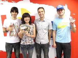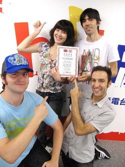 難得來到Hit Fm90.1高屏電台,前進樂團很用心的帶了樂器來節目中,要用現場演唱讓南台灣的朋友更加認識他們。一連演唱了三首歌曲,除了有受到大家喜愛的【對不起,我的中文不好】之外,前進樂團還特別準備了一首尚未發表的中文歌曲-【留在你身邊】,以及五月天的【志明與春嬌】,流利的國台語,加上深情的歌聲,讓現場掌聲再度響起,連錄音室外的電台工作人員都靠過來伸出大拇指給了一個「讚!」,在場的每個人都貨真價實的感受到前進樂團的魅力。看到獲得這麼熱烈的迴響,貝斯手北極熊害羞的說,其實前進樂團的中文都還在持續加強中,近期最大的目標,是希望可以在今年年底發行一張全中文專輯。為了祝福前進樂團能在台灣順利發行中文專輯,Hit Fm90.1高屏電台特別準備了一張【中文合格證書】,頒發給前進樂團的團員們,鼓勵他們對於台灣的熱愛,也證明前進樂團的中文真的很好啦!