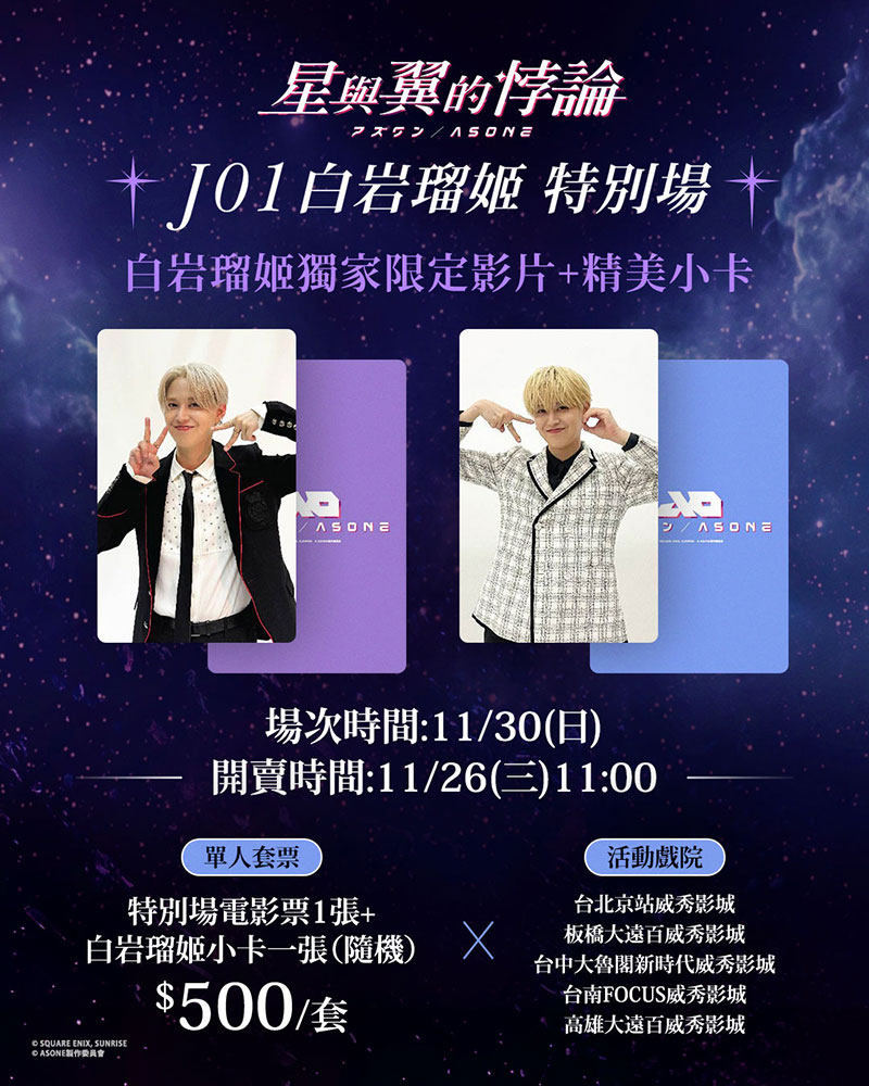 改編自SQUARE ENIX人氣街機遊戲的科幻動畫電影《星與翼的悖論》(AS ONE),集結《名偵探柯南》劇場版導演靜野孔文、《新世紀福音戰士》(EVA)角色設計貞本義行以及《鋼彈》系列機械設計形部一平,三大名匠聯手打造奇幻動人的星際史詩,將於11月21日在台隆重獻映。日本人氣男團「JO1」成員白岩瑠姬首次跨界挑戰動畫配音,在即將上映的科幻鉅作《星與翼的悖論》中主演懷抱音樂夢想的高中生「陽」,並親自創作電影主題曲〈巡星〉,全程投入角色塑造,展現他歌聲以外的全新魅力。白岩瑠姬坦言,最初完全沒想到自己會挑戰聲優,至今仍清楚記得接到《星與翼的悖論》邀約時的驚訝瞬間。立刻開始查資料、閱讀劇本的他,帶著要成為「陽」的心情,全心投入這次的挑戰。然而初次配音的經驗也帶來小插曲,白岩瑠姬笑說:「平常我們錄歌都是非常靠近麥克風的,所以我第一次配音時候也靠麥克風超近,但其實聲優錄音要保持一定的距離,當我一開始靠太近講台詞時,現場工作人員就會喊『太近了、太近了!』」他笑稱,配音的第一課就是從調整與麥克風的距離開始學起。