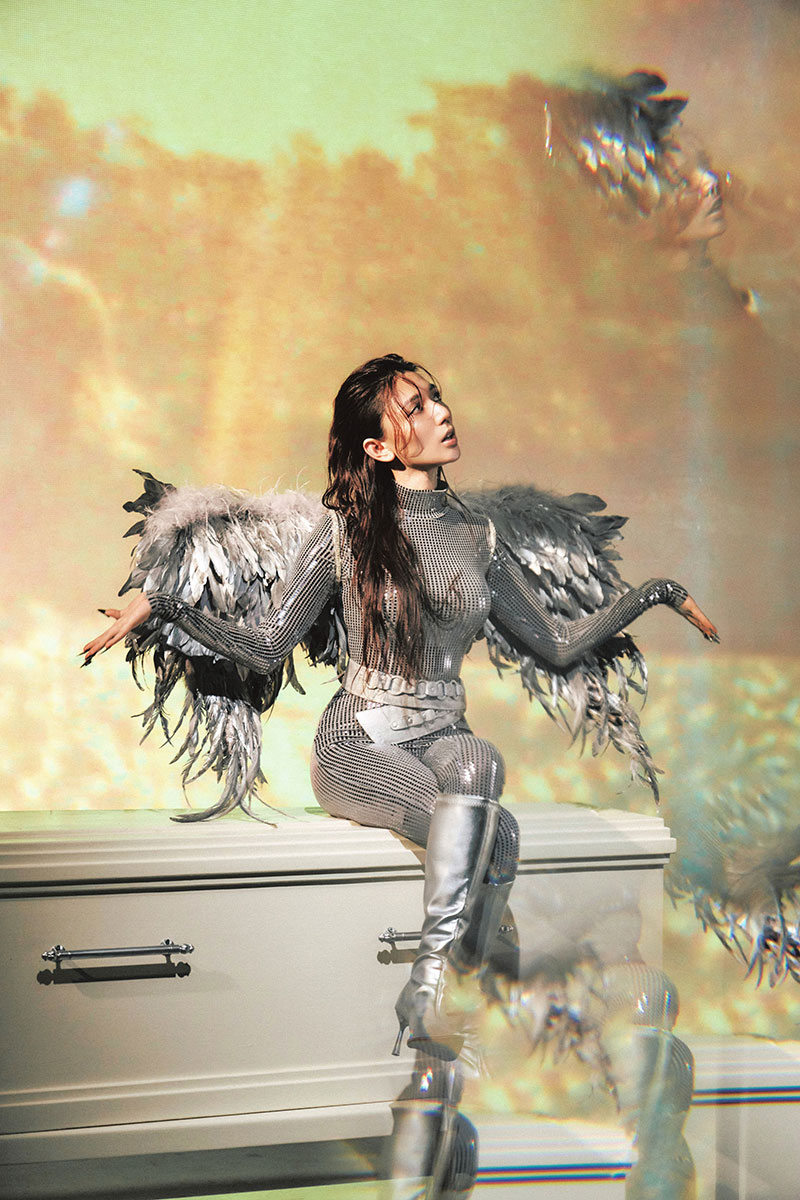 而Haezee在MV中,換上超級合身的銀色連身造型,背上十分有份量的羽毛翅膀,延續〈我為未知活著〉MV中的天使形象,不過這位天使這次是坐在棺材上,唱著歌曲,身後不斷投影出各種生活片段,Haezee表示,坐在棺材上,不是因為靠近死亡,而是因為那裡最貼近人類的脆弱與真實,「對天使而言,棺材不是終點,而是人們最需要被接住的地方,承載恐懼、告別與來不及說出口的話。」因此她坐在那裡,不打擾、不干預,只是陪著每一個走過人生日常的每一段片刻,生與死交界的人,替那些被忽略的瞬間,靜靜守住重量。不過由於造型太過合身,加上羽毛翅膀太重,時間一久勒得她肩膀非常疼痛,但她在鏡頭前必須保持著天使般的神情,她展現意志力,完美拍攝,讓她笑著說:「真的很考驗演技。」