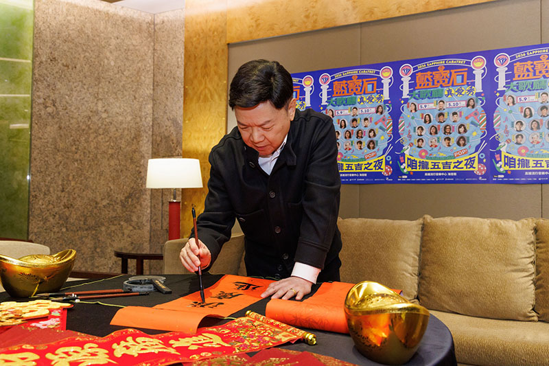 儼然化身為「福祿壽喜」藍寶石開運四寶的四位秀場天王天后 難得同台揮毫為賀歲卷軸落款,現場拿出筆墨真本領宛如「仙拚仙」;其中擅長畫畫的苗可麗特別在題「滿」字時發揮創意以「金鑽」入字,特別畫上了一顆閃亮的鑽石符號,象徵財源滾滾,讓一旁的侯怡君見狀忍不住發動雙關語講吉祥話:「根本就是為藍寶石量身打造,太鑽(賺)啦!」而畫了兩個金元寶的苗可麗看到墨水飽滿到快要溢出紙面時,靈機一動大喊:「錢要滴出來、滿出來了! 代表看藍寶石的觀眾通通都是寶,通通都有錢!」而秀場長青樹 黃西田則神來一筆地寫下氣勢磅礴的「金」字,笑說:「因為藍寶石就是一個賺錢的地方(台語:賺錢的所在)!每個人進去都能賺大錢,所以一定會有金,而且是金光閃閃!」至於神情專注寫下「進」字的葉啟田謙虛自評「寫不好啦!但希望這個字能招來福氣,觀眾都進來!錢也進來!」隨後更為歌迷獻上祝福,「大家新年快樂!希望我們『馬年相見,馬上有錢』,你的錢會增加啦!」