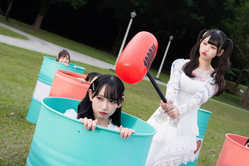 不過遊戲看似可愛,現場卻瞬間變成競技場。林易沄自爆打地鼠時太認真,一度忘記在拍MV,還不小心打到成員;蔡伊柔笑喊:「林易沄打我!公報私仇欸。」蔡亞恩更點名黃奕霖與陳穎臻是「射不準大師」,道具直接飛越攤位,讓大家邊拍邊撿笑成一團。劉曉晴則在射擊關卡徹底上頭,直呼明明打中卻一直不倒,越玩越不甘心。原本甜美MV,意外拍出一場誰都不想輸的「少女競技實錄」。