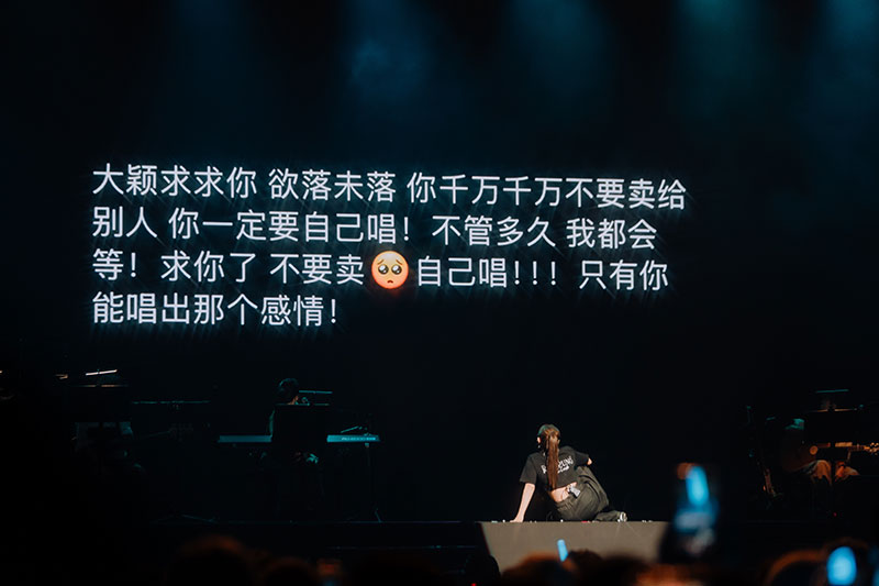 她亦在現場表達對創作者的感謝,感謝郭家瑋與張簡君偉老師到場支持,郭家瑋更於二樓清唱〈過了幾天〉送給全場粉絲。對於張簡君偉為她創作的新歌〈靠關係〉,大穎也特別致謝,並表示「謝謝你們聽大穎的歌」。甚至在 Day2 的演出最後,演唱尚未完成的〈欲落未落〉,全世界首唱只有在台灣,足見誠意。大穎表示「一開始想把這首歌賣給別人唱,但是有太多粉絲希望我留著自己唱,我會再考慮一下。」儘管對於場地限制未能呈現最完整演出略感遺憾,她仍承諾未來將挑戰更大型場館,現場觀眾齊聲喊出小巨蛋、大巨蛋,她感動回應:「謝謝你們相信我!」